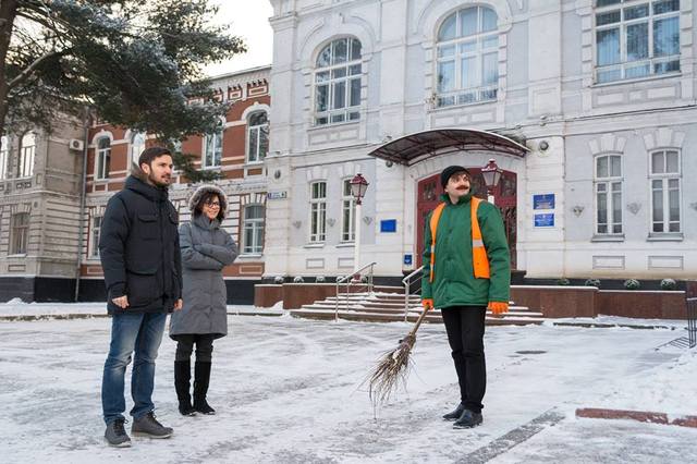 Олександру Симчишину довелося одягнути жилет двірника (із діркою) та вийти на вулиці міста, щоб розчистити сніг (під час зйомок у місті він ще лежав). Утім, як каже мер, для нього розкидати сніг не важко, оскільки цим почав займатися ще років з п’яти – вдома у батьків, а потім і у власному дворі, тож нічого нового для себе не виніс.