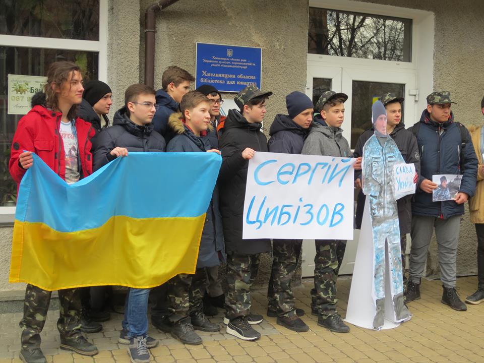 Працівники обласної бібліотеки для юнацтва разом з учнями Хмельницького колегіуму №16 долучилися до Всеукраїнського флешмобу «Об’єднаємося разом». Вони вигукували гасла: «Свободу Сергію Цибізову!!!», «Відновимо кордони України!!!»