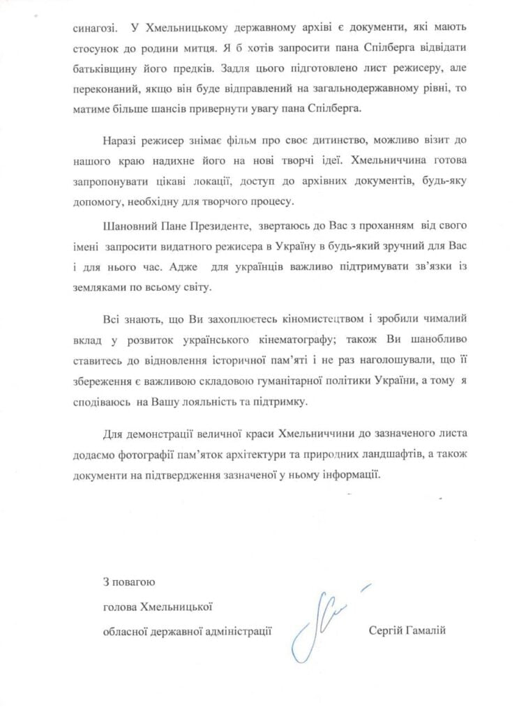 Тому голова Хмельницької ОДА Сергій Гамалій звернувся листом до Президента України Володимира Зеленського з проханням підтримати ініціативу та запросити видатного режисера Стівена Спілберга відвідати Україну. Про це сьогодні, 10 січня, повідомив на своїй сторінці у соцмережі Сергій Гамалій.