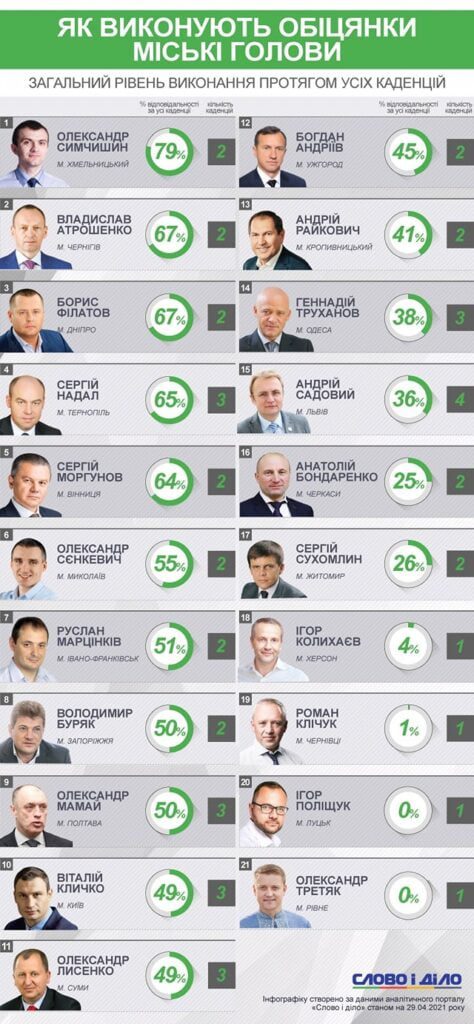 Аналітики порталу «Слово і Діло» і надалі продовжують слідкувати за тим, як міські голови виконують власні обіцянки. Спеціалісти фіксують обіцянки, які дають мери. Надалі Аналітики моніторять виконання цих обіцянок міськими головами. Комусь вдається добре з цим справлятися, а комусь – не дуже. За даними аналітичного порталу, наразі найгірше виконують власні обіцянки міський голова Луцька Ігор Поліщук та міський голова Рівного Олександр Третяк. Це їхні перші каденції. Поки що мери цих міст не виконали жодної обіцянки і рейтинг їхньої відповідальності дорівнює нулю.
