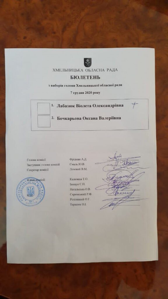 «Спираючись на статтю 60 регламенту роботи Хмельницької обласної ради, недійсними вважаються бюлетені невстановленого зразка, без відтиску печатки, а також бюлетені, які містять позначки не у квадраті навпроти прізвища кандидата. Один із бюлетенів, який і став вирішальним 33 бюлетенем за Віолетту Лабазюк, мав би бути визнаним недійсним, оскільки у ньому позначка стояла не у квадраті, а поза ним. Але лічильна комісія чомусь взяла його до уваги, хоча він узагалі не мав би розглядатися. При цьому обласна рада порушила регламент, за яким має працювати, а потім, уже з порушеннями, прийняла рішення, яким затвердила Віолетту Лабазюк головою обласної ради», – каже Оксана Бочкарьова.